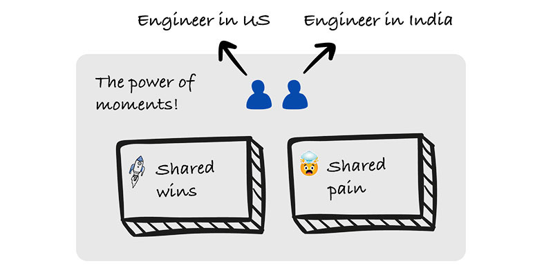 We made a list of starter projects for each quarter, then we paired every new hire in India with an experienced engineer from the US. Working together on projects this way created stronger moments of connection between them.