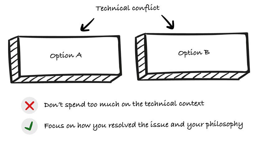 They typically present a technical dilemma, option A vs. option B and spend too much time on technical context. But this question evaluates your ability to manage difficult situations, get alignment, and make decisions when necessary.