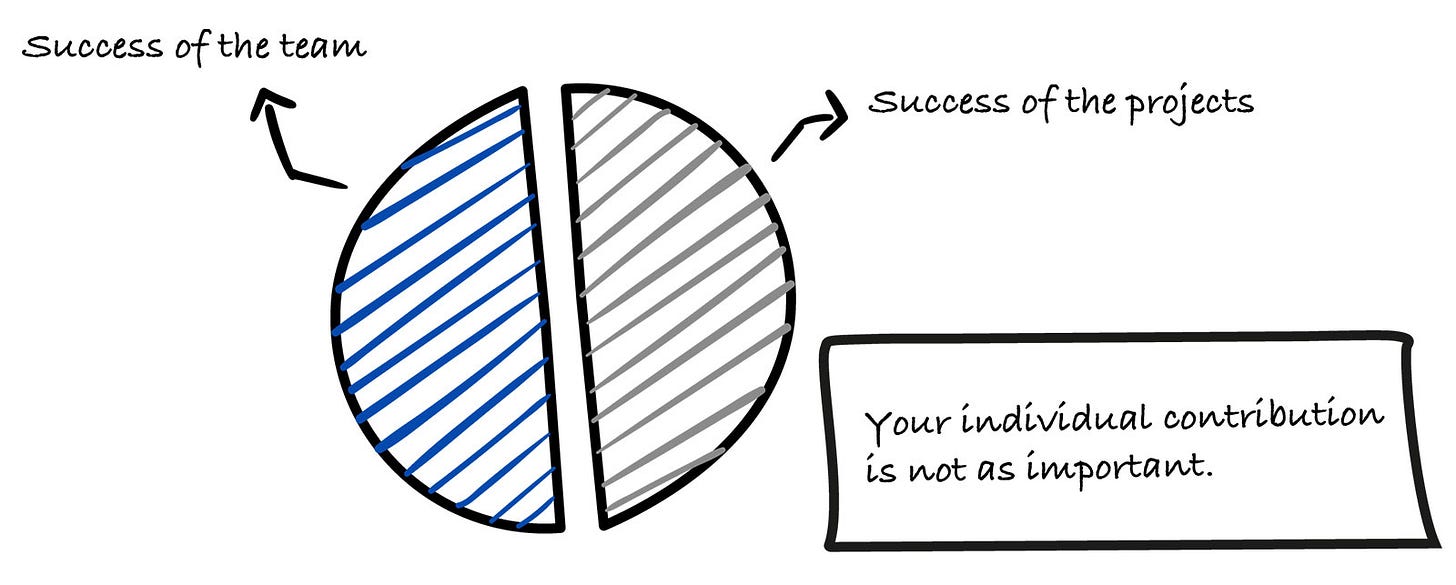 You are not judged by your individual contribution anymore. The overall success of the team and projects is what becomes important.