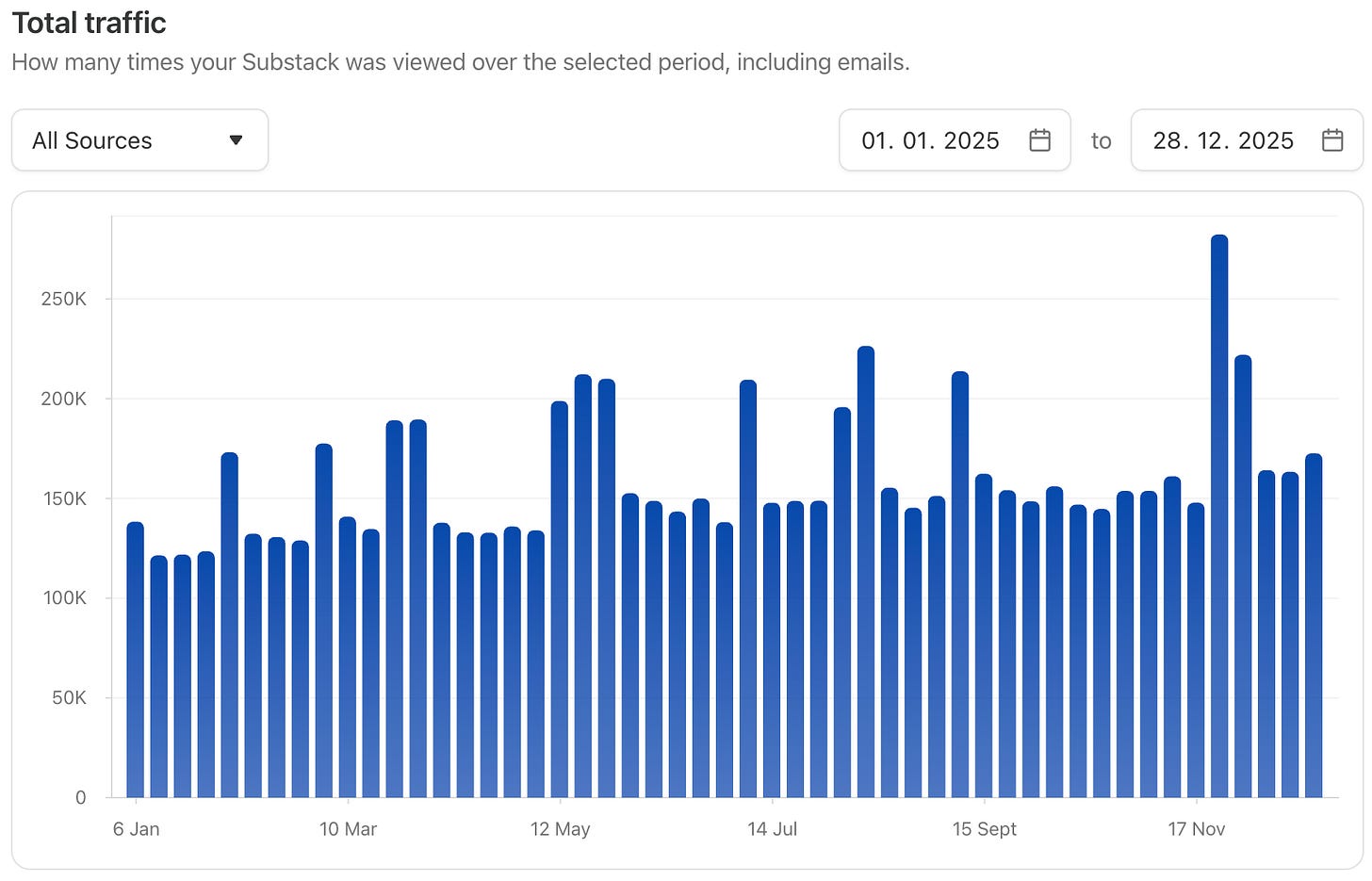 5M+ views in 2025 (up from 3.5M~ views in 2024) → main sources: email, Substack app, LinkedIn, Reddit, Google)
