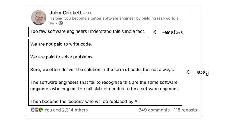 Each post should consist of two core elements: the headline (also often referred to as the hook) and the body, followed by an optional call to action (CTA).