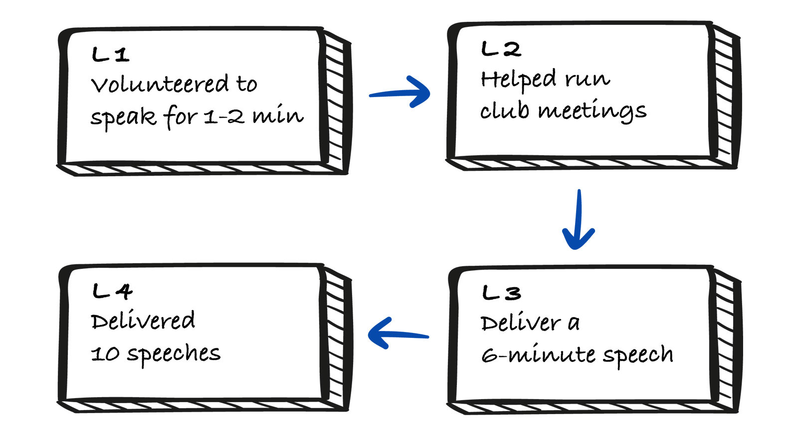 Level 3: After 90 days, I mustered the courage to deliver a 6-minute speech. The goal of this speech was to introduce myself to the club members. I continued to give one speech every month.