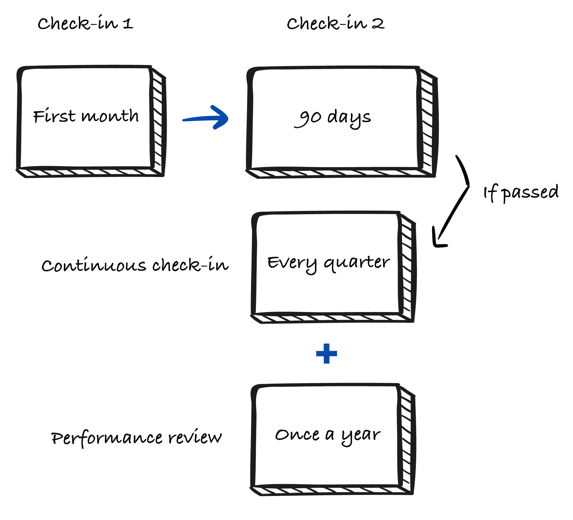 Candidates would get evaluated in a check-in in their first month and after 90 days. Every employee is re-evaluated every quarter through a written performance check-in.