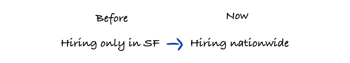 We moved to remote first during the pandemic, and with that, moved from hiring in SF only to hire nationwide (and later, in 10+ countries). This resulted in a massive increase in talent pool size.