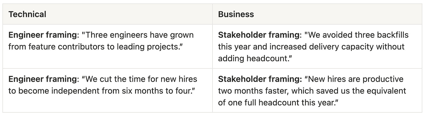 Engineers care about learning and autonomy. Stakeholders care about stability, cost, and delivery capacity. If you don’t translate one into the other, your impact won’t land.