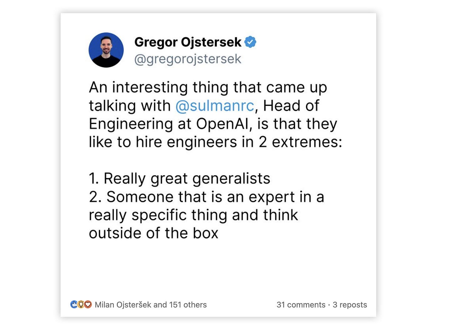 Interestingly, Sulman mentioned that OpenAI likes to hire engineers in 2 extremes: