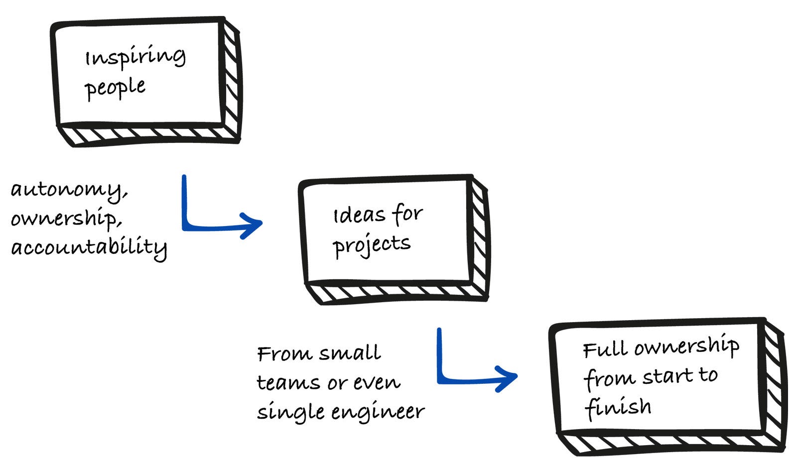 The most successful projects usually come from very small teams, often just two or three people. Sometimes an entire feature is built by a single engineer who owns everything end-to-end: