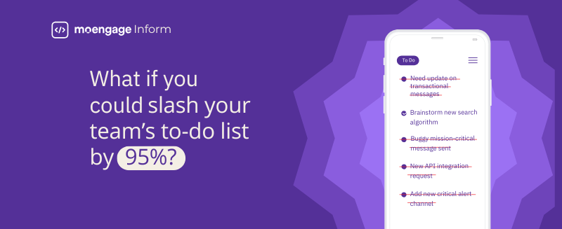 MoEngage Inform is a single-API infrastructure for critical alerts that cuts costs by 60% and frees up dev bandwidth by 95%, so they can focus on P0 tasks instead.