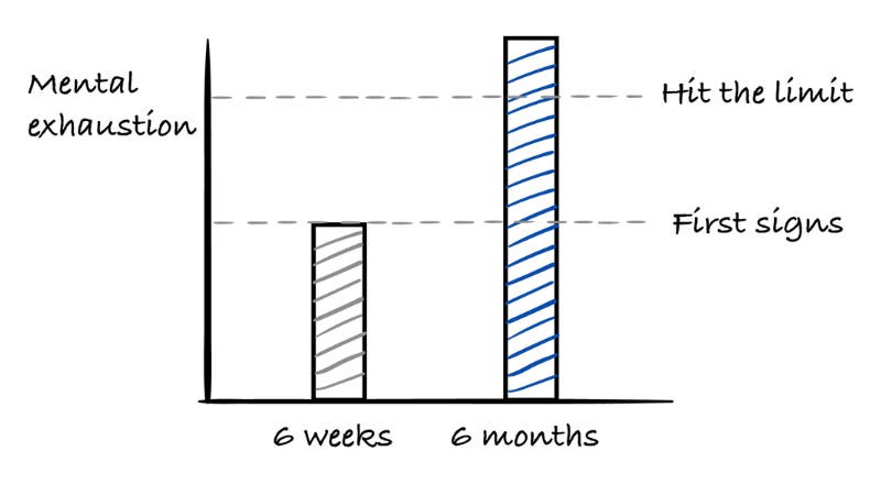 In my own experience with burnout, it was about 6 months before I recognised what was going on, but looking back, it was probably only 6 weeks for the signs to start showing.