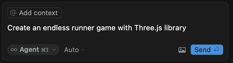 I knew I wanted to use Three.js as the library of choice and I wanted to stick to vanilla JS and HTML to make it as simple as possible. So the first prompt in the composer looked like this: