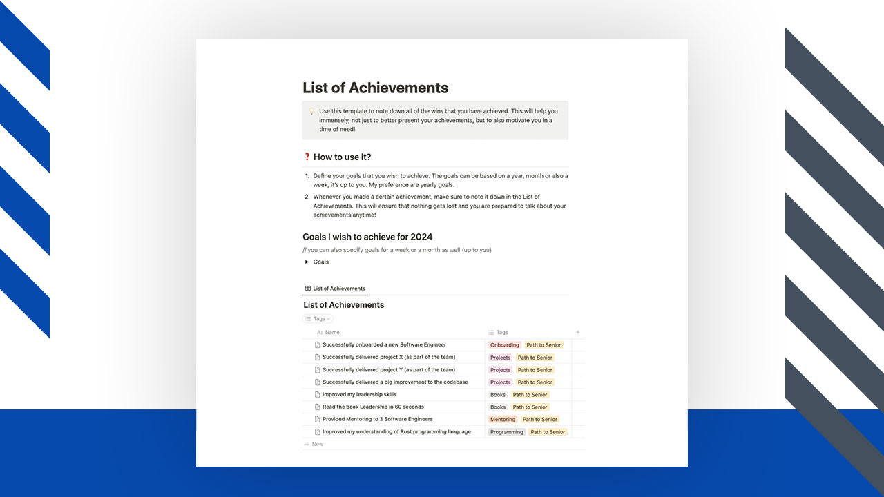 Use this template to note down all of your achievements. This will ensure that you are ready if someone asks you and that you stay motivated!