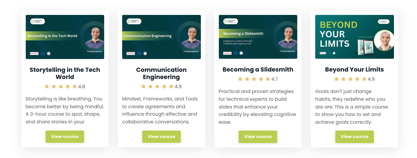 That’s when I thought of online cohort courses. I had run workshops for more than a decade at Oracle, so I leveraged that experience to design a 4-week online course on Maven, titled Communication Engineering. I launched my first cohort in September 2023, six months after starting my business. Seventeen people from four countries joined.