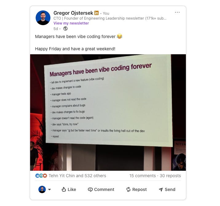It also explains what vibe coding is in the context of a manager that’s not actually a good manager, but what a lot of people perceive a manager to do.