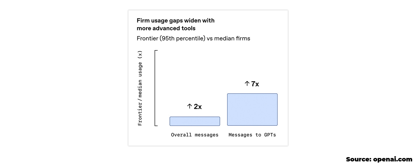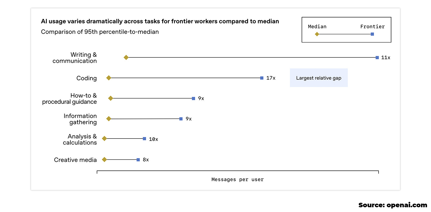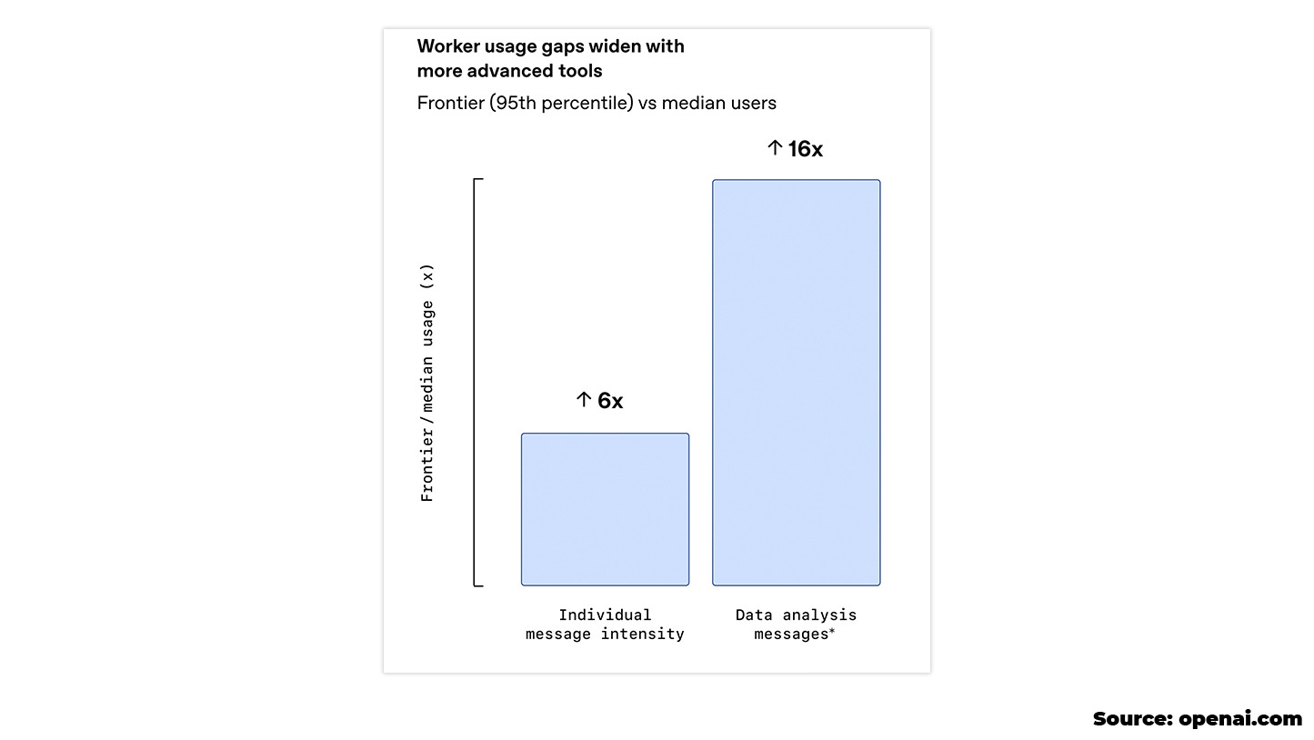 The chart below shows how much more top users (“frontier users”, the top 5%) use advanced AI tools compared to typical users (median → 50~%).