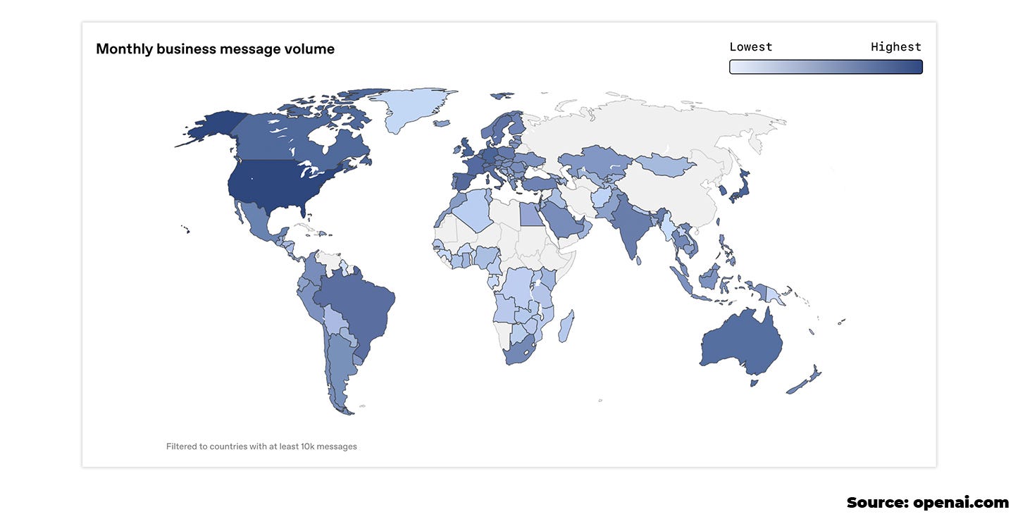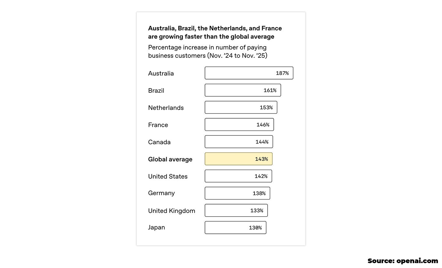 Australia, Brazil, the Netherlands, France, and Canada are above the global average in the number of paying business customers of OpenAI (Australia by far in the first place)