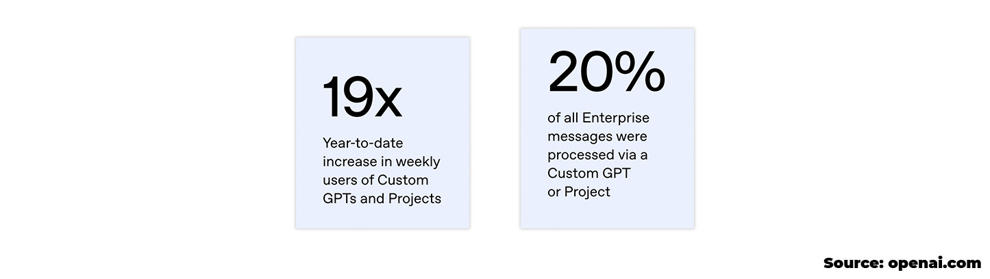 Weekly users of Custom GPTs and Projects have increased by 19x from November 2024, and an interesting data point is that 20% of all the Enterprise messages were processed via Custom GPTs or Projects.