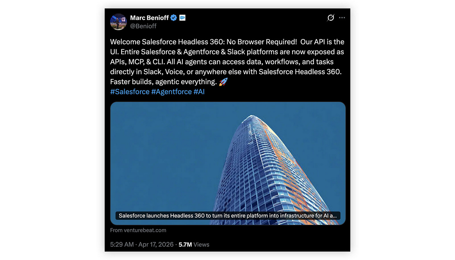 For 25 years, using Salesforce meant working inside Salesforce. A customer service rep opened a console, clicked into a case, and manually updated its status. A human, navigating a platform, to get work done.