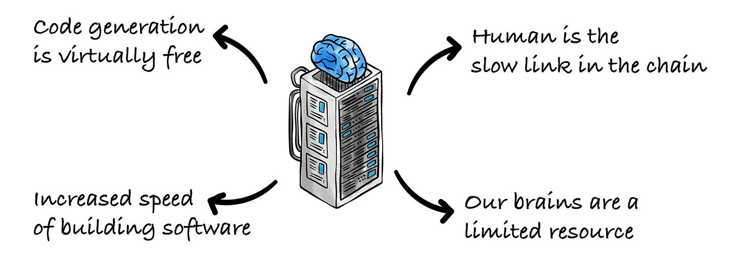 We are the slow link in the chain. As code generation becomes virtually free, codebases will balloon in size. The difficulty shifts to the negotiation between the APIs of multiple AI agents.