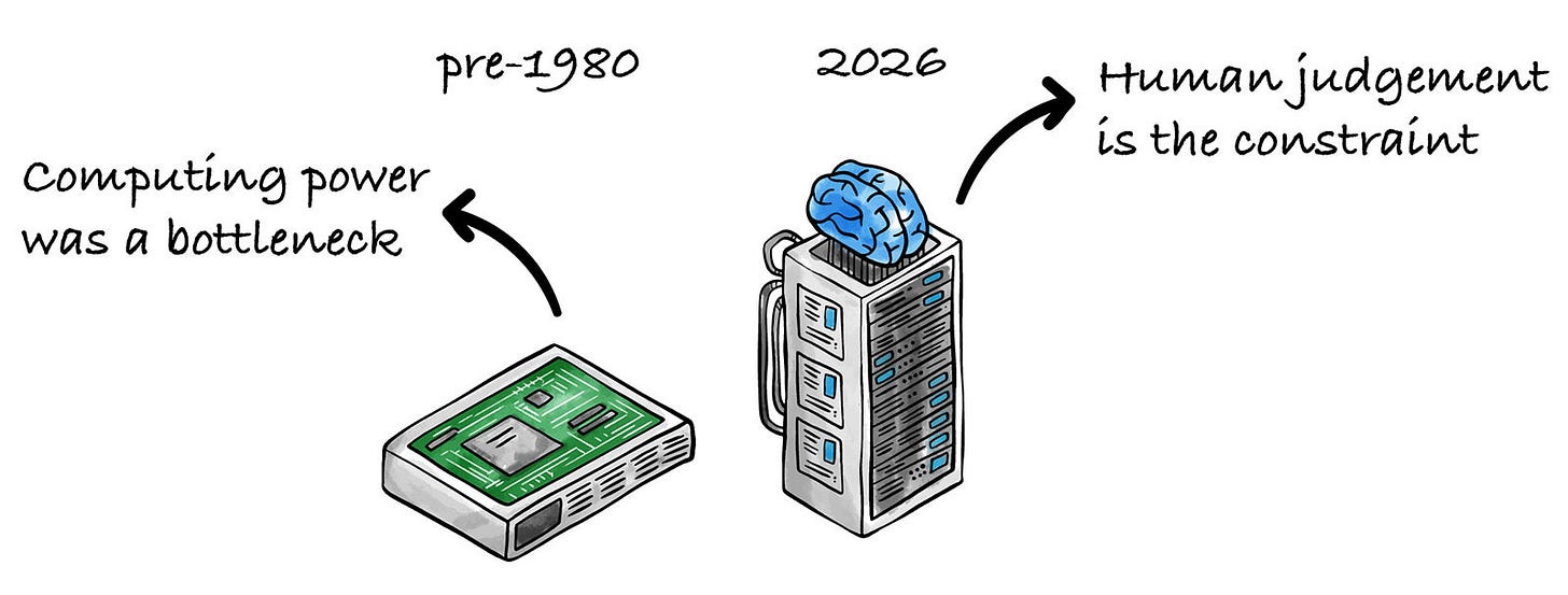 The bottleneck shifted from hardware to logic construction. The personal computer and Moore’s Law made compute abundant, so the machine was no longer the primary constraint.