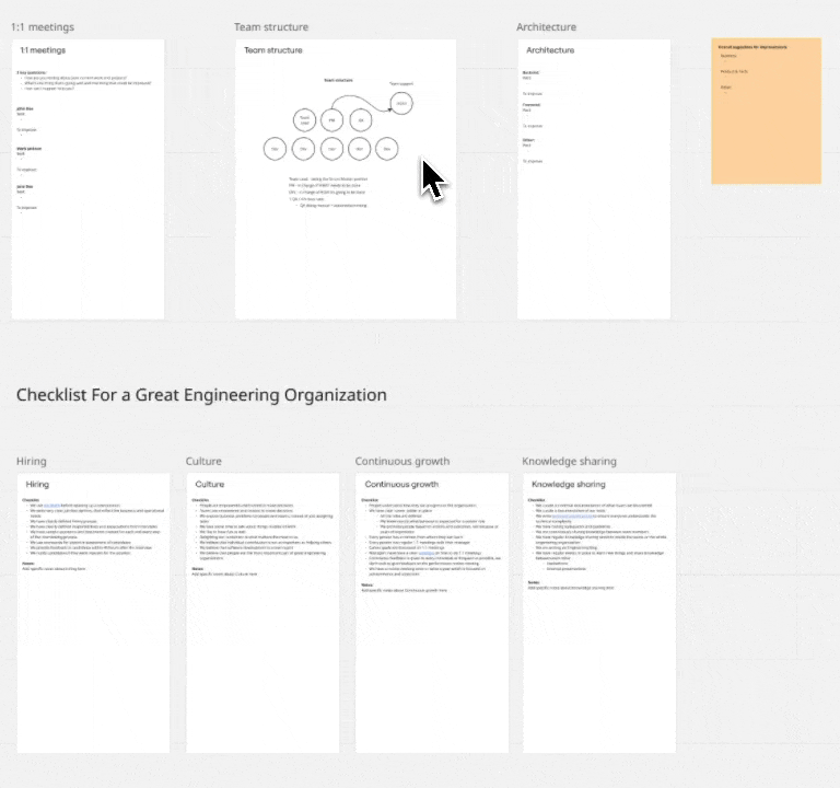 I found out that having one big board is a lot easier to consume and understand, instead of having multiple pages of separate topics. I found that a Miro board works really well for this.