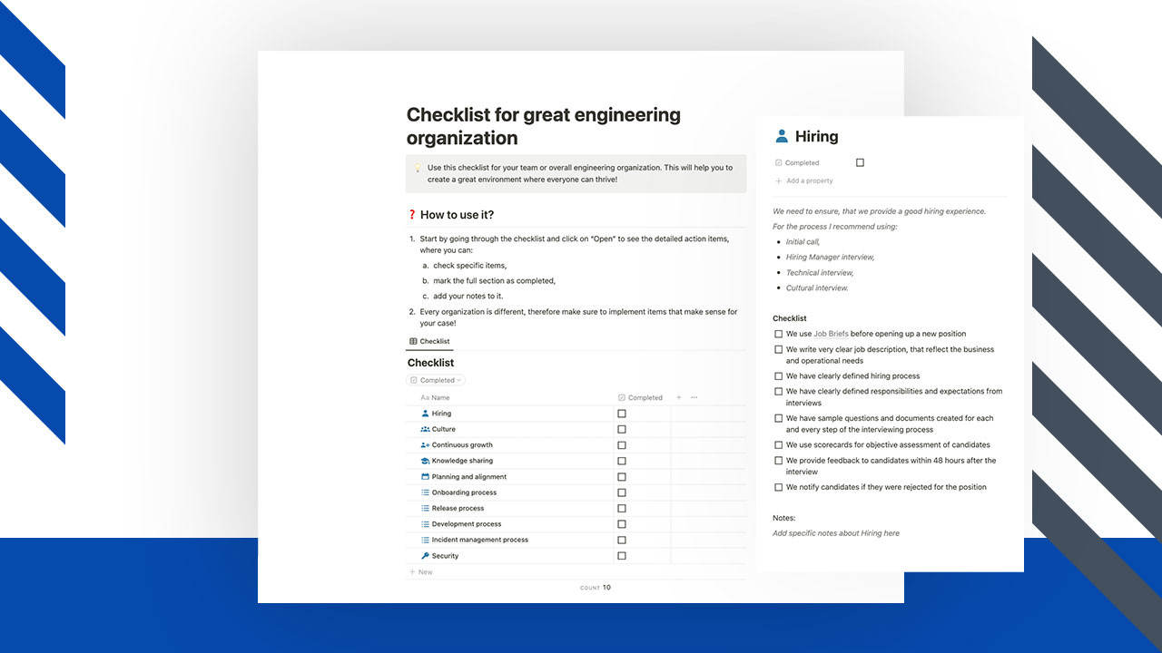 The first one is the Notion Template: Checklist for a Great Engineering Organization.