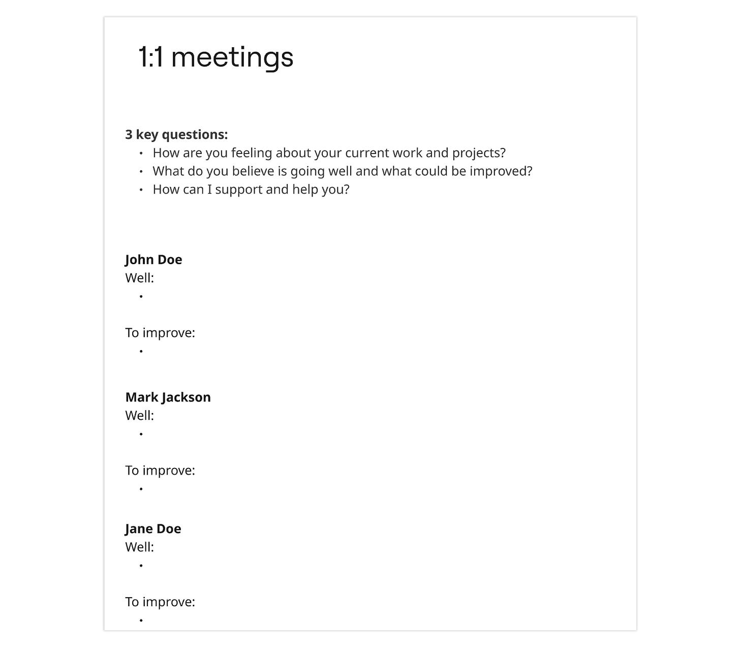 I make all the notes from 1:1s in the board. This is the part of the board where I put all my notes in: